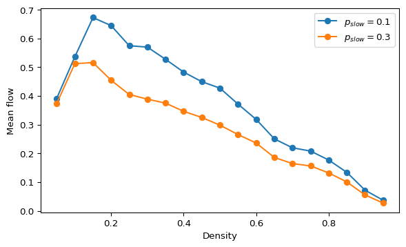 Use several seeds if you want smoother curves. For example, estimate the mean flow for each density with 5 to 10 trials and then average the stationary values.