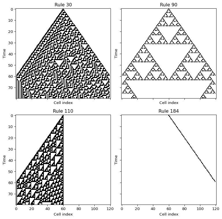 Rules 30, 90, 110, and 184 are a good first comparison because they already show very different behavior.