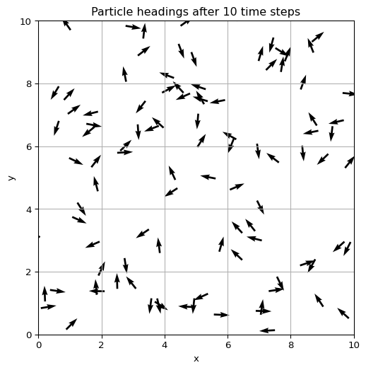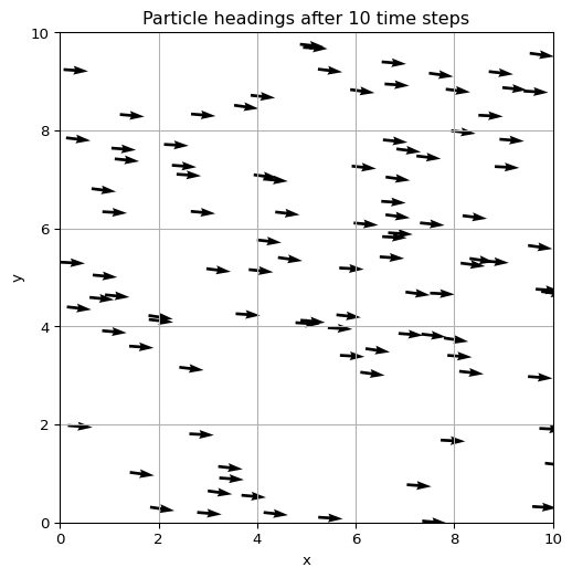 import matplotlib.pyplot as plt# Initialize parametersnum_particles =100box_size =10# Linteraction_radius =1.0# rnoise_strength =0.1# etav0 =0.03# speed of particles# Initialize particle positions and headingsxy, theta = initialize_particles(num_particles, box_size)# Update positions and headings for a few time stepsfor t inrange(10): xy, theta = vicsek_equations( xy=xy, theta=theta, noise=noise_strength, box_size=box_size, radius_interaction=interaction_radius, v0=v0, )# Plot the headings of the particlesplt.figure(figsize=(6, 6))plt.quiver( xy[0], xy[1], np.cos(theta), np.sin(theta), angles='xy', scale_units='xy', scale=2, # bigger scale means smaller arrows)# Limit the plot to the box sizeplt.xlim(0, box_size)plt.ylim(0, box_size)plt.title('Particle headings after 10 time steps')plt.xlabel('x')plt.ylabel('y')plt.grid()plt.show()
