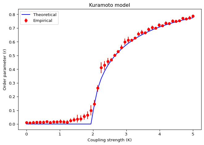 In other words, the more oscillators are synchronized, the stronger the coupling becomes, which in turn promotes even more synchronization. This positive feedback can lead to a phase transition from incoherence to coherence as the coupling strength \(K\) crosses a critical threshold. The critical coupling strength \(K_c\) can be derived analytically for certain frequency distributions (e.g. Cauchy) and can be estimated numerically for others (e.g. normal).